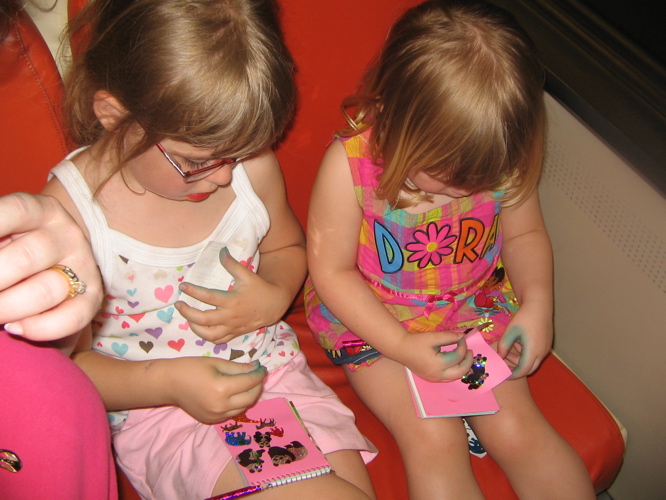 Katie and Emmy play with their souveniers